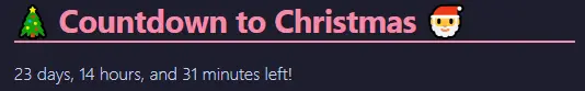 christmasContainer.createEl("p", { text: `${daysToChristmas} days, ${hoursToChristmas} hours, and ${minutesToChristmas} minutes left!` });